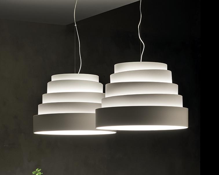 La suspension se caractérise par un mouvement de formes concentriques - un design original pour un contexte moderne. L’effet scénographique est assuré et double si les lampes sont par paires.