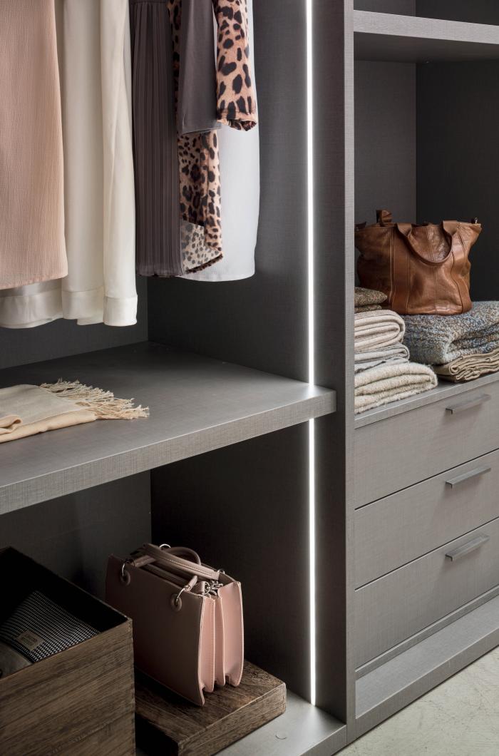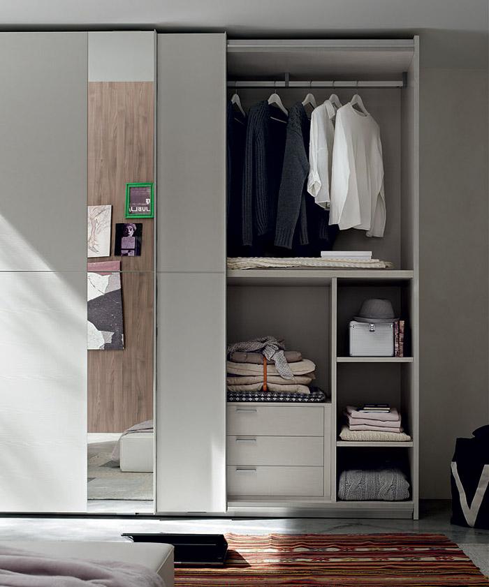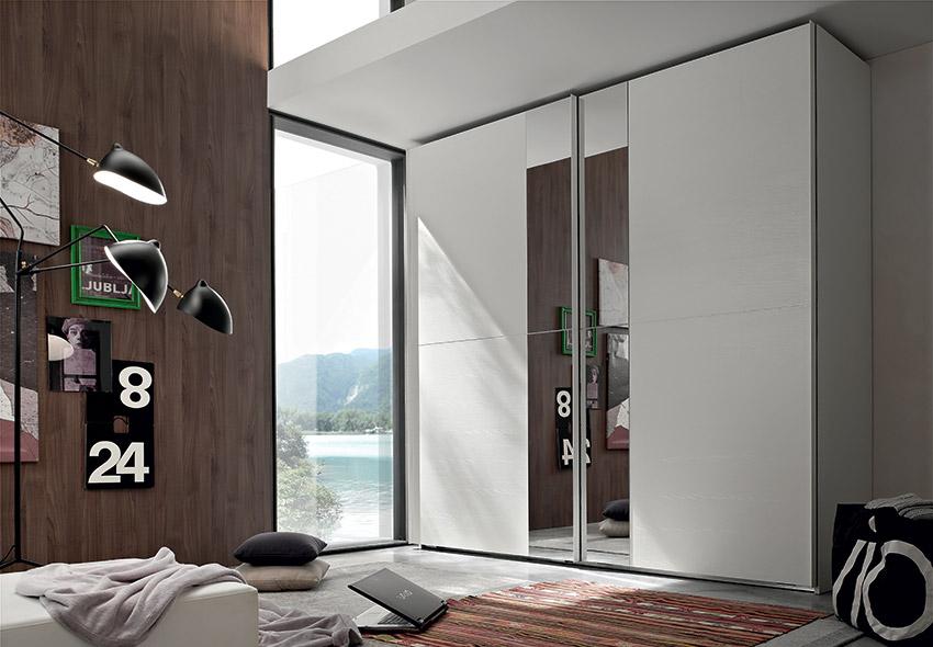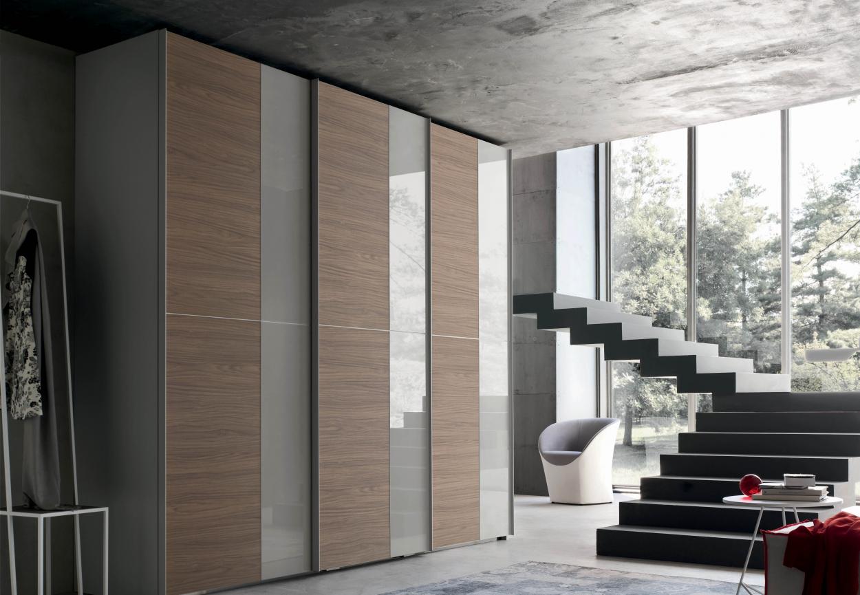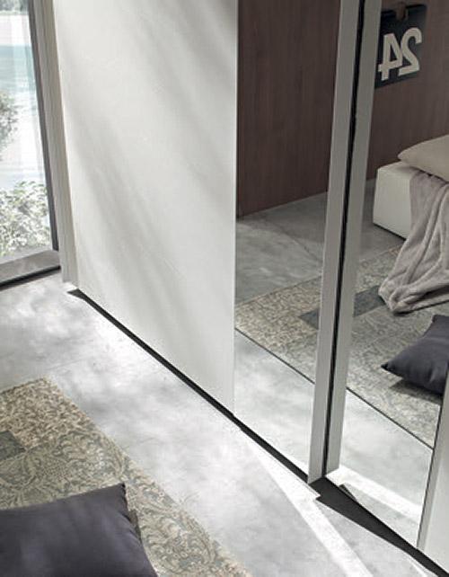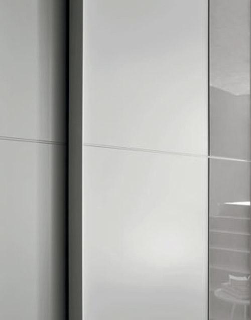 Les bandes verticales qui caractérisent la porte peuvent être positionnées à droite ou à gauche et personnaliser dans les matériaux avec le miroir ou le verre laqué. Le profil est de la même couleur que la porte