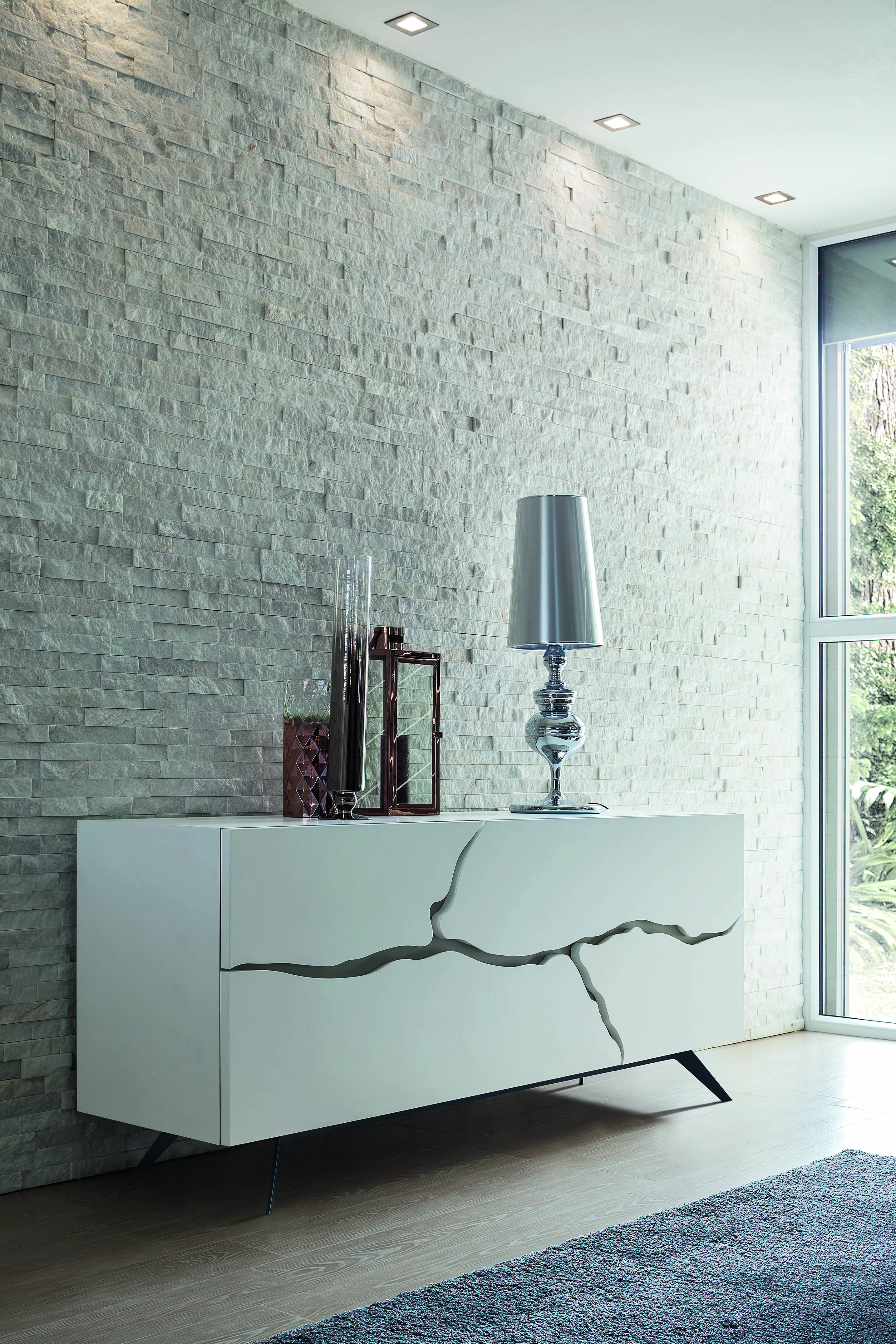 le design crée sur la surface du buffet un design qui traverse l’avant et divise de manière originale les deux tiroirs