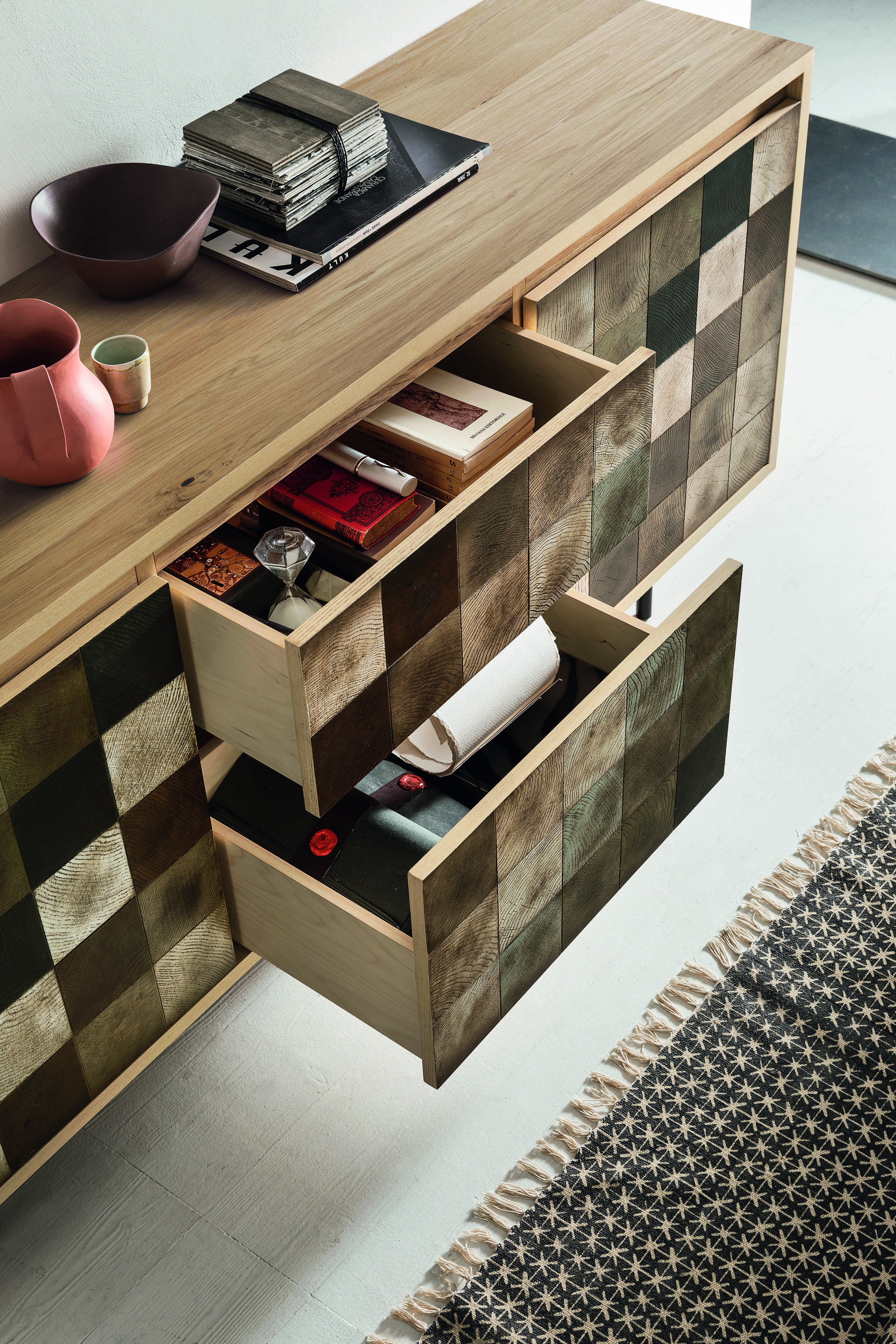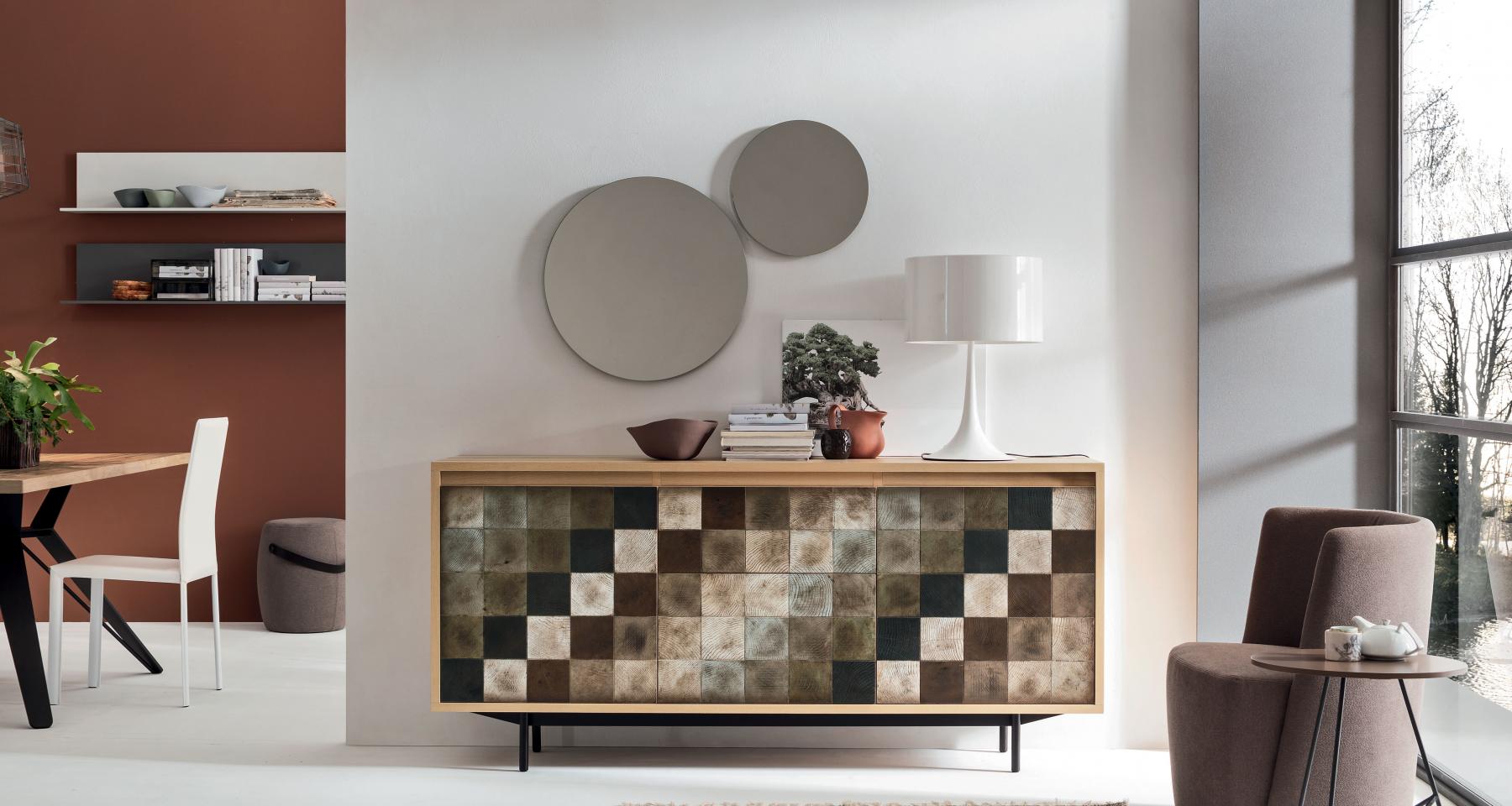 Le buffet ressemble à un échiquier: des carreaux de différentes nuances décorent les portes et les tiroirs avec un effet vintage.