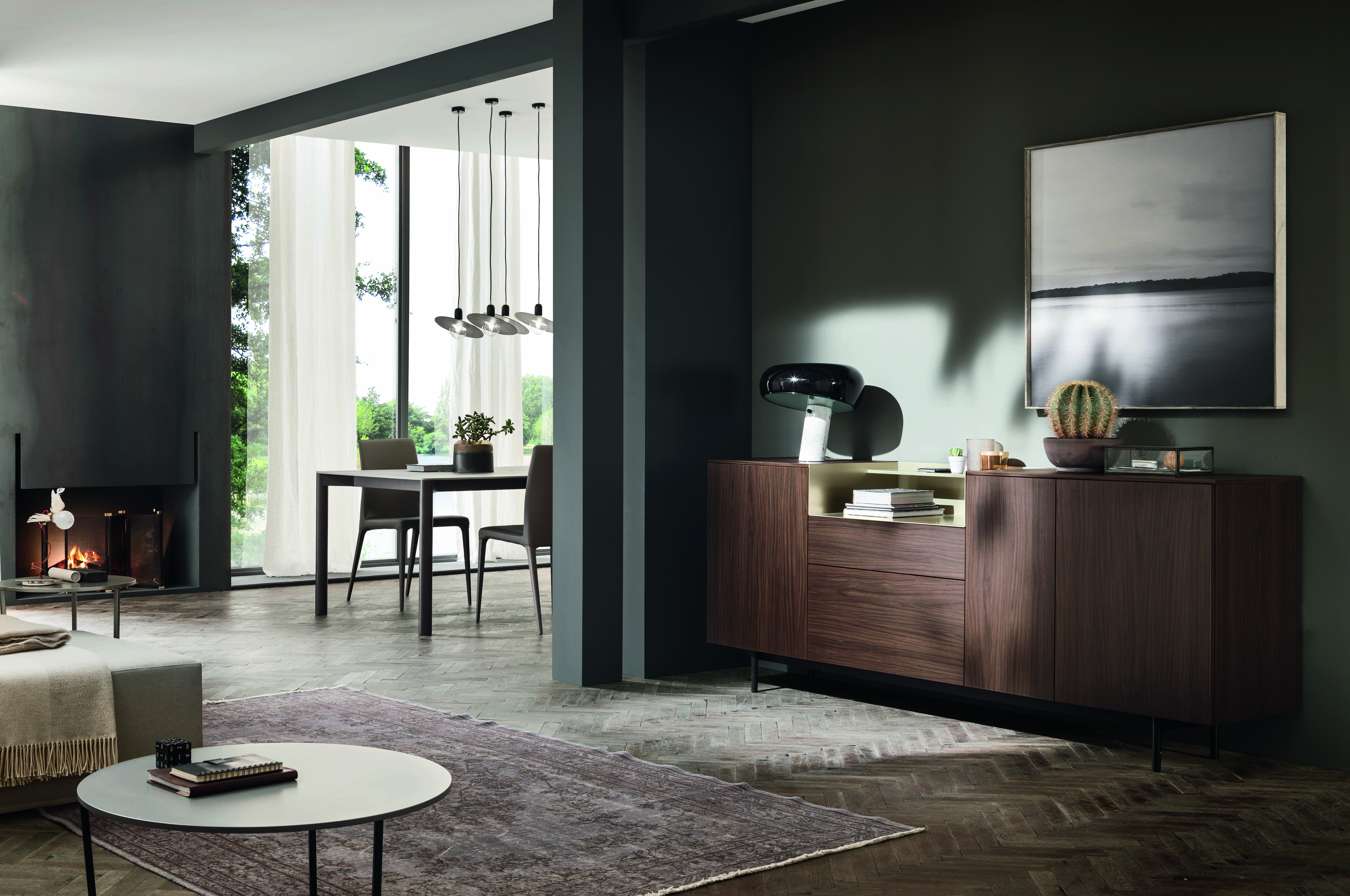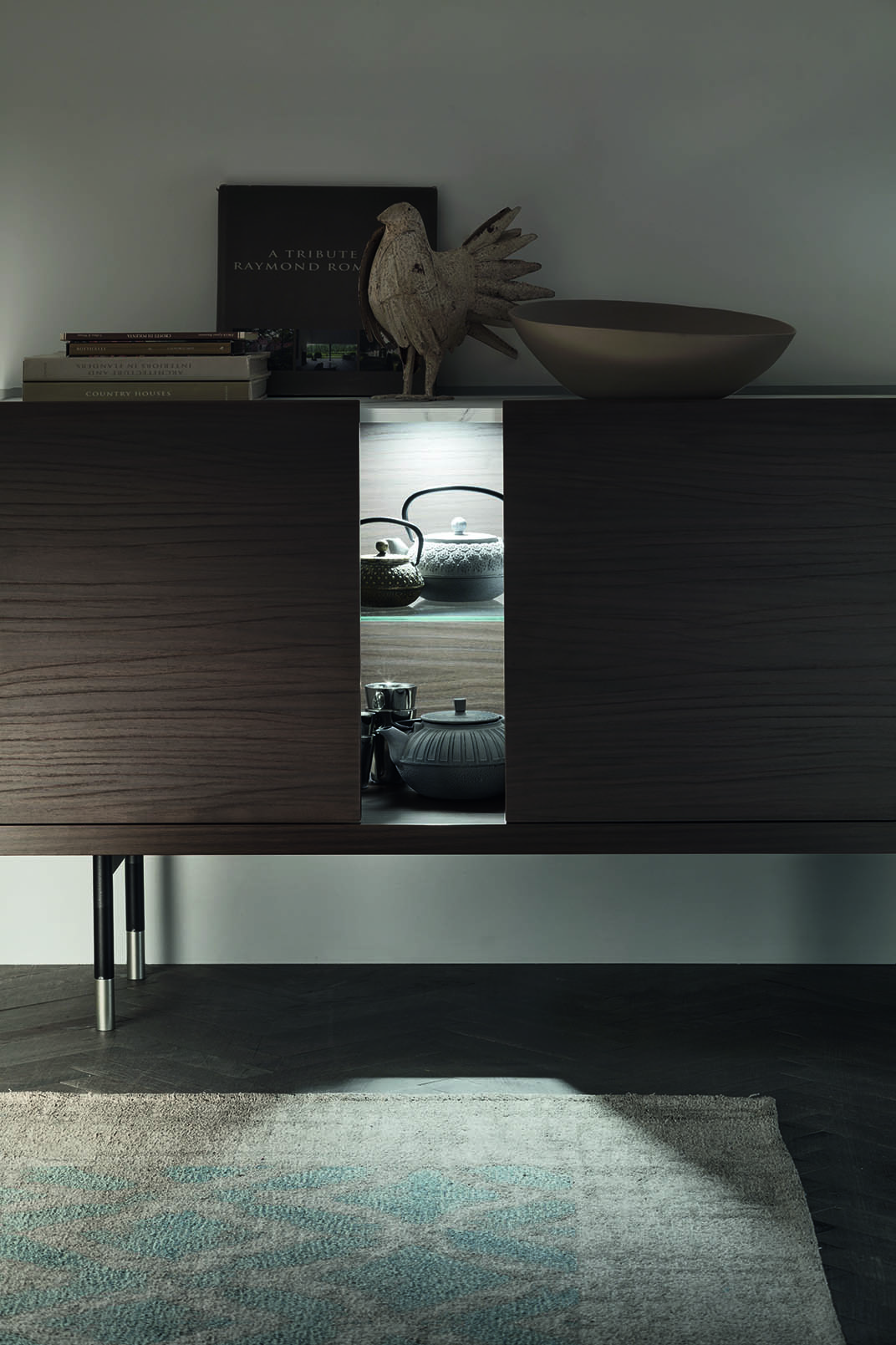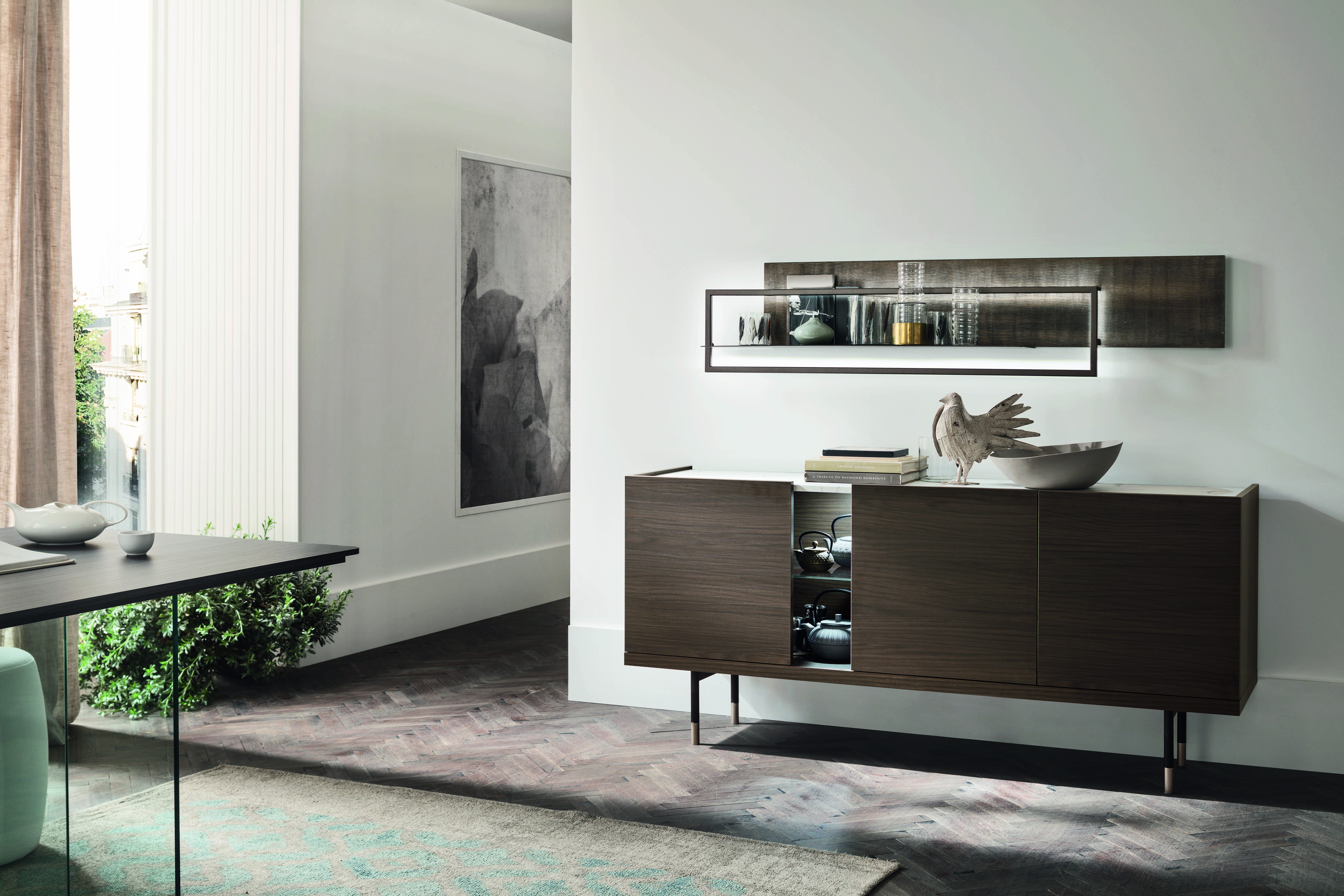 Lorsqu’elle est fermée, le vantail de la porte laisse un espace ouvert et met en valeur les objets qu’elle contient.