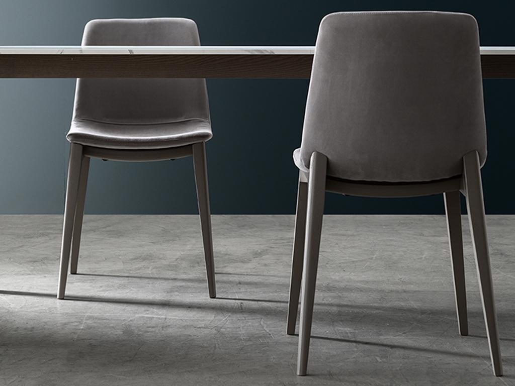 La structure, de forme élancée et robuste en substance, soutient le siège rembourré qui ne fait plus qu’un avec le dossier. Le frêne massif est combiné avec des tissus ou des éco-cuirs.