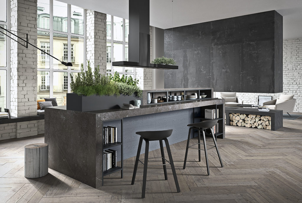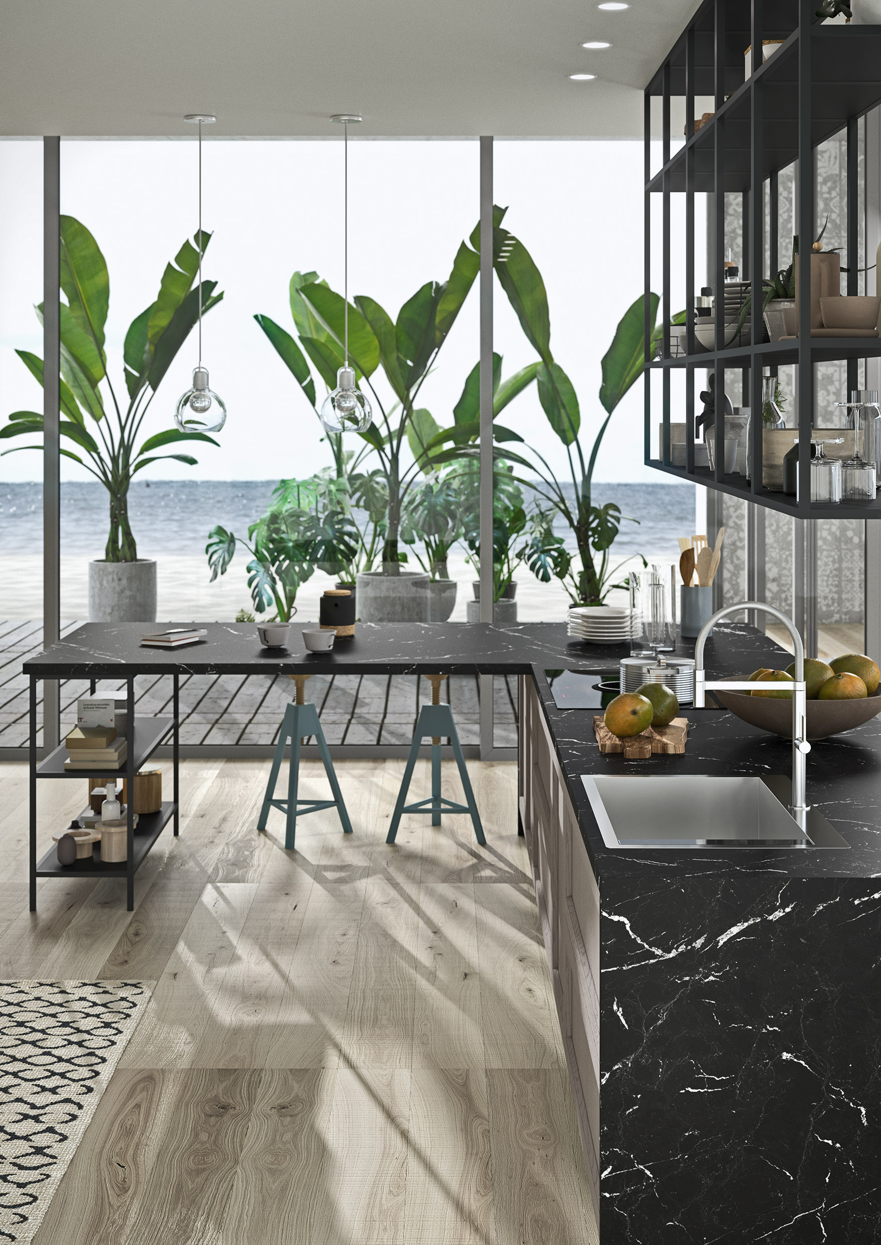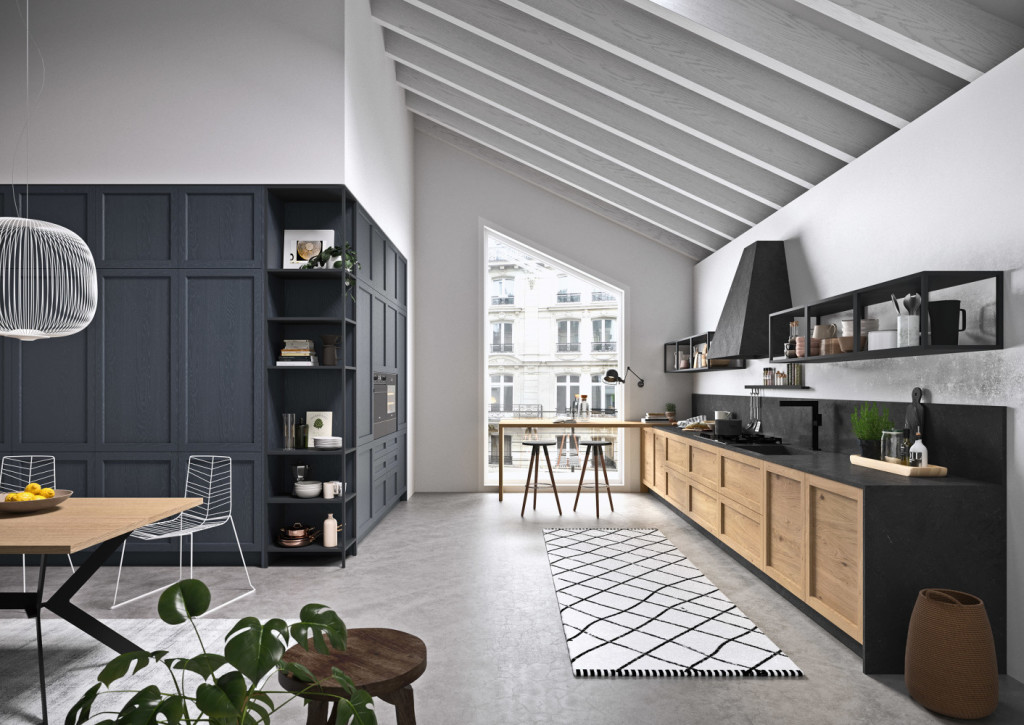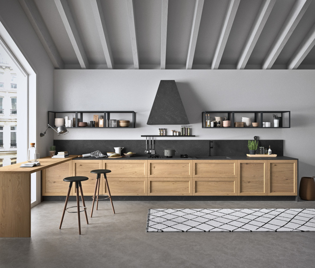 Dans cette collection de cuisines modernes, le bois de différentes essences est souvent magistralement combiné avec des matériaux plus high-tech, mettant en valeur leurs qualités et optimisant leurs caractéristiques structurelles et d’utilisation.