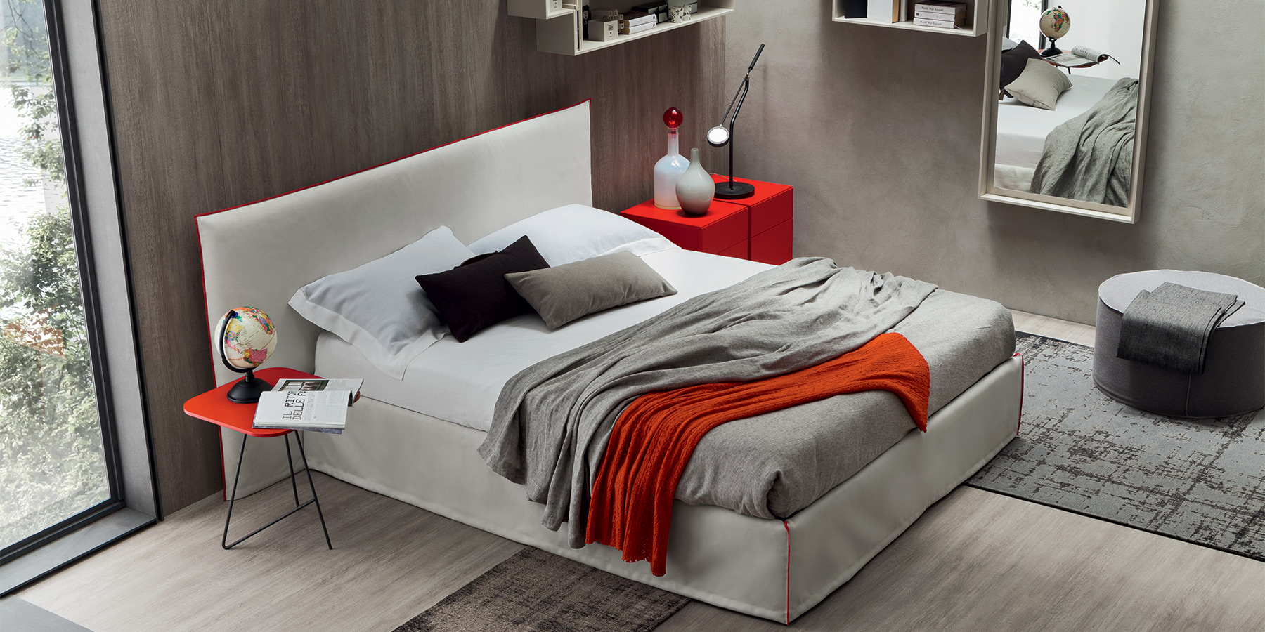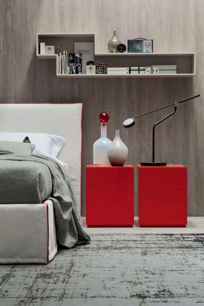 Le lit est entièrement rembourré en tissu. Les surpiqûres contrastées sont un détail élégant qui délimite la tête de lit et met en valeur les angles