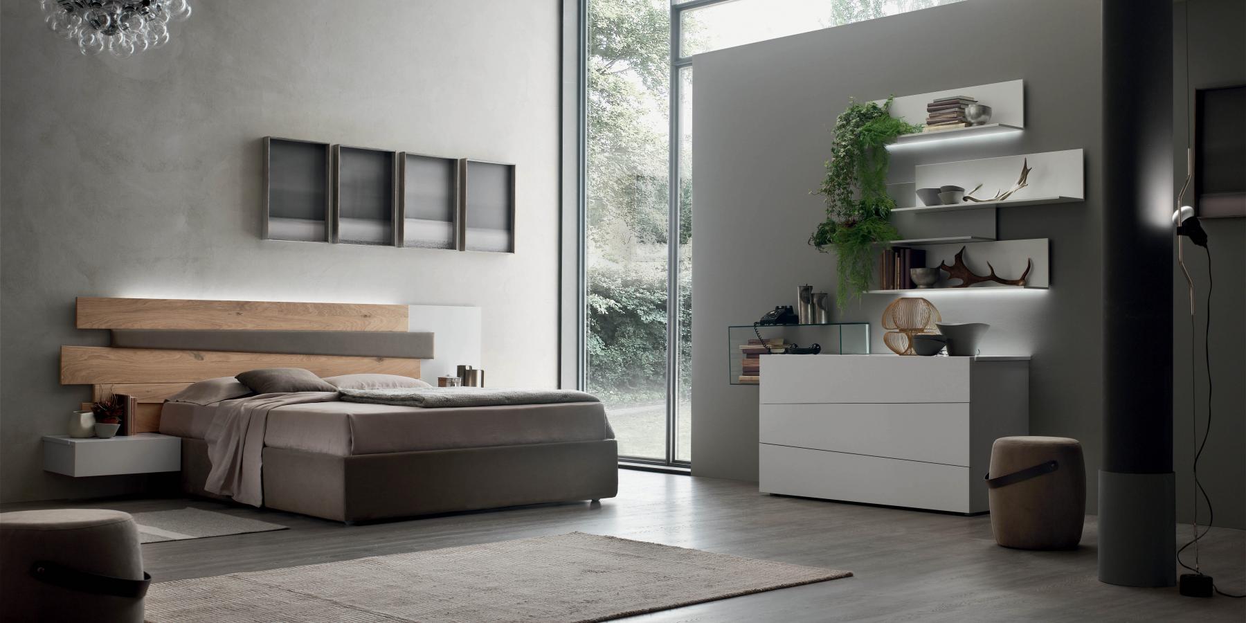 Les lattes de chêne, l’insert en tissu et le panneau laqué donnent forme à une tête de lit qui ressemble à une boiserie.