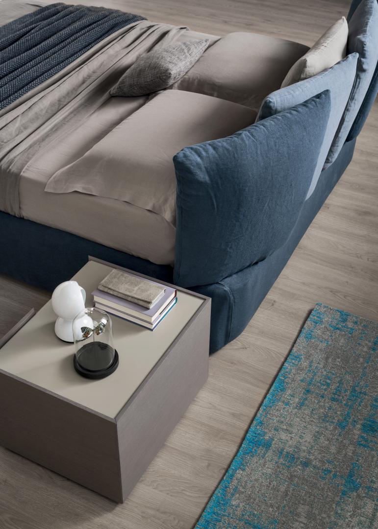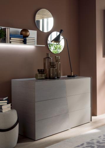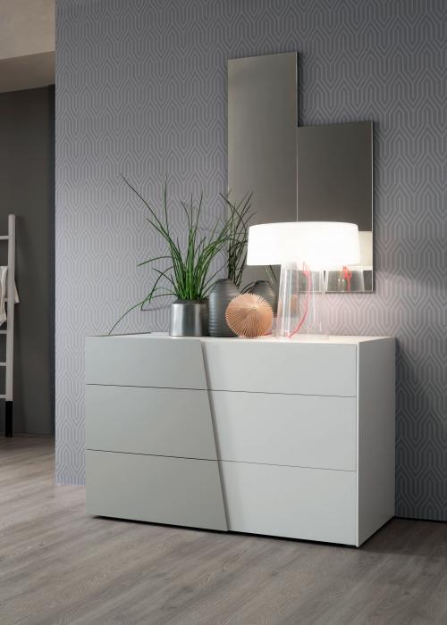Les inserts appliqués sur les tiroirs forment une ligne diagonale qui divise les façades de la commode en deux. Il est possible de créer différentes combinaisons de finitions et de couleurs.