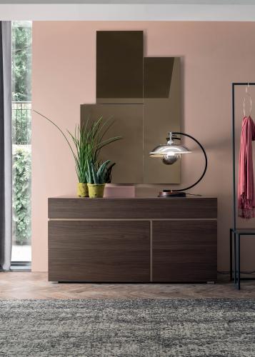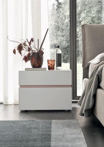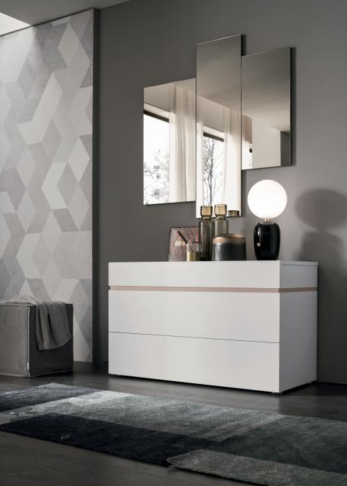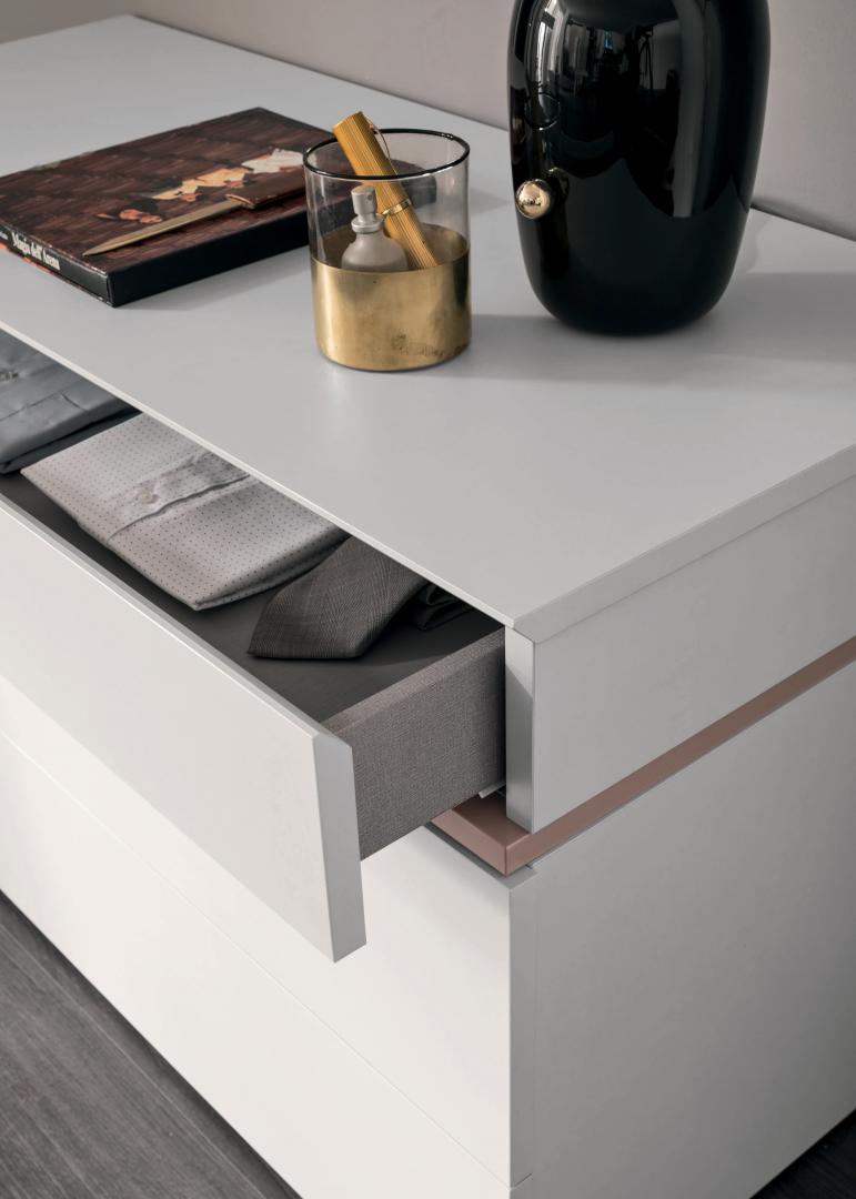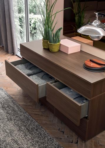 Un insert décoré sépare les tiroirs plus larges du tiroir supérieur, conçu pour contenir de petits objets et accessoires.