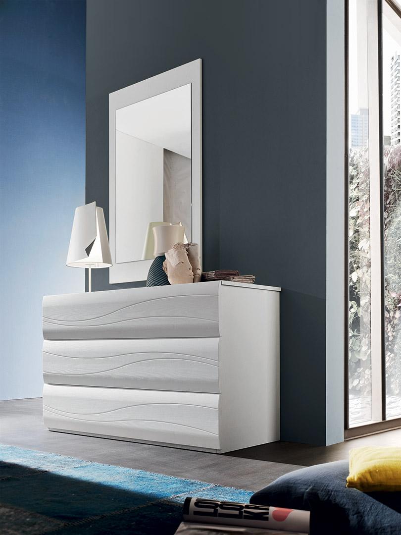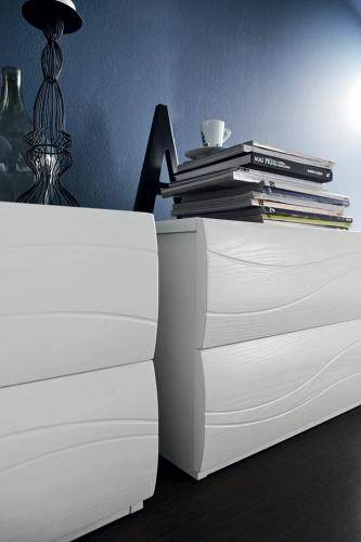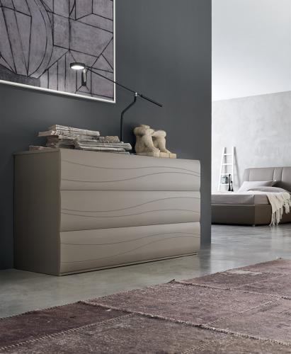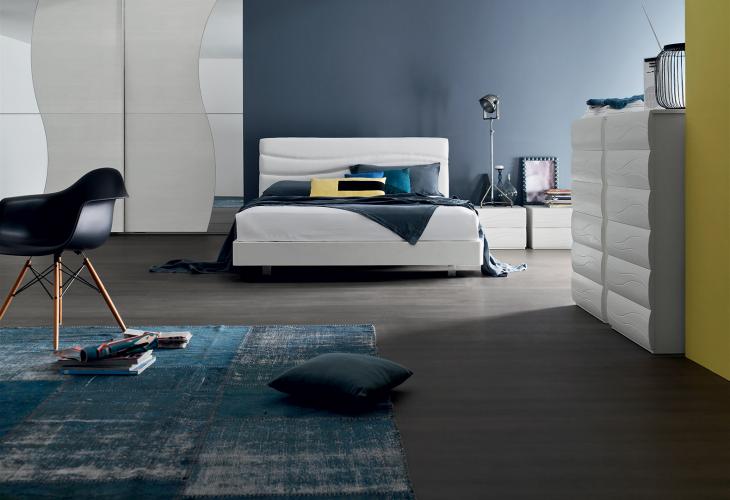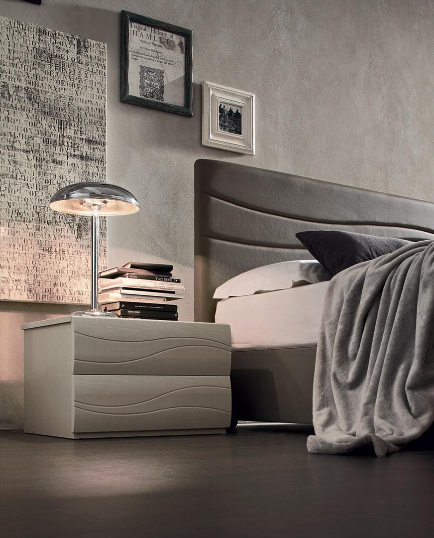 Les gravures sur les façades s'accorde avec la tête de lit rembourrée. Un jeu de lignes qui rappelle tout le mobilier.