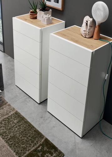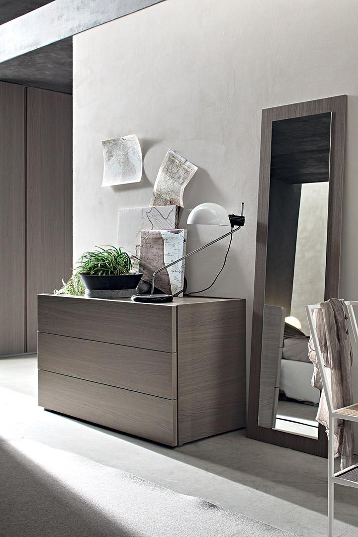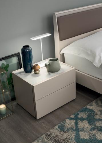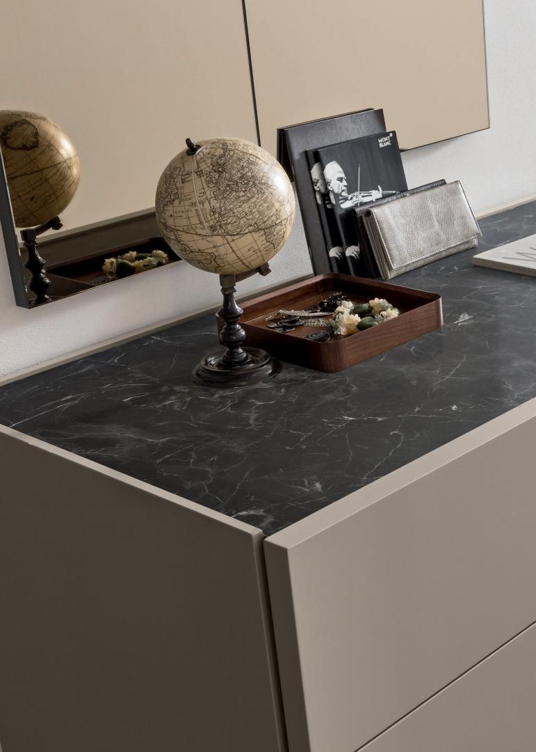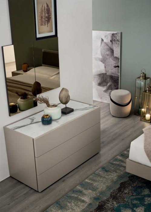 Blanc, sombre ou naturel : trois effets de marbre recouvrent le dessus de la commode et de la table de chevet. Un design géométrique enrichi