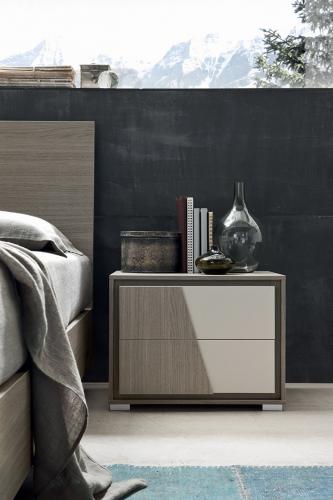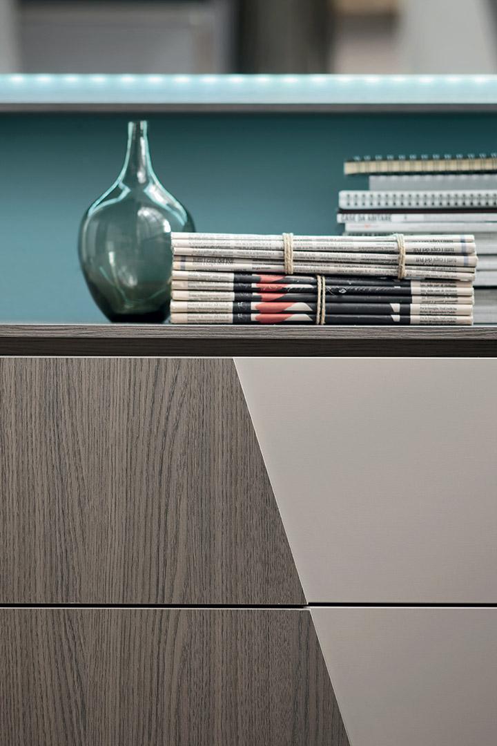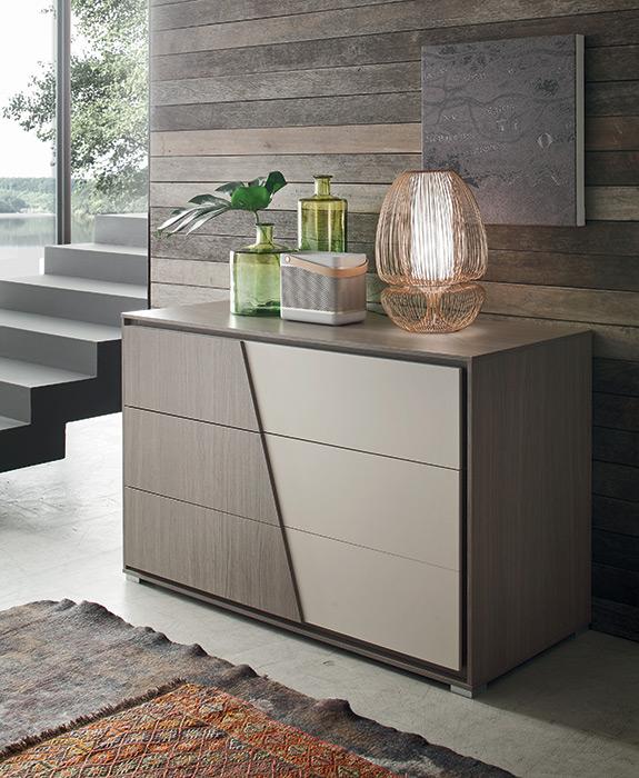 Une coupe diagonale divise les tiroirs et les finitions des commodes et des tables de chevet en deux. Le meuble encadre les façades et rend le mobilier encore plus créatif.
