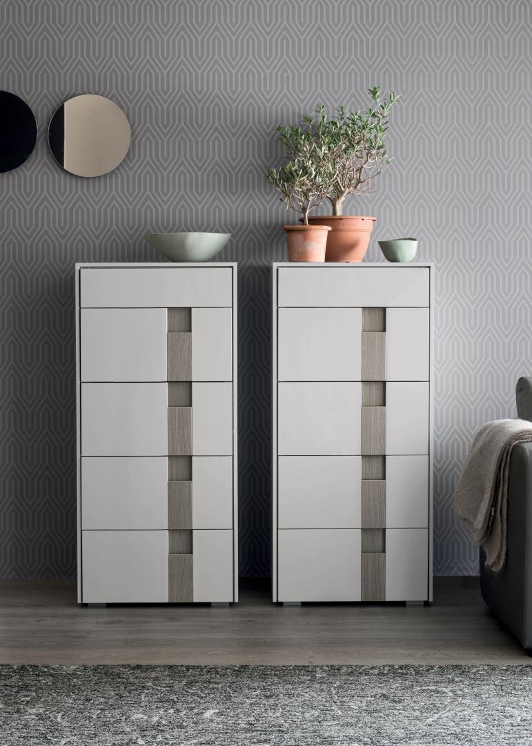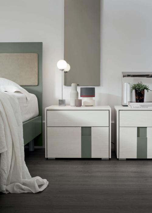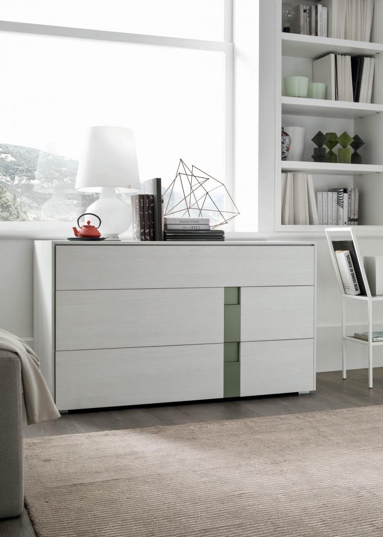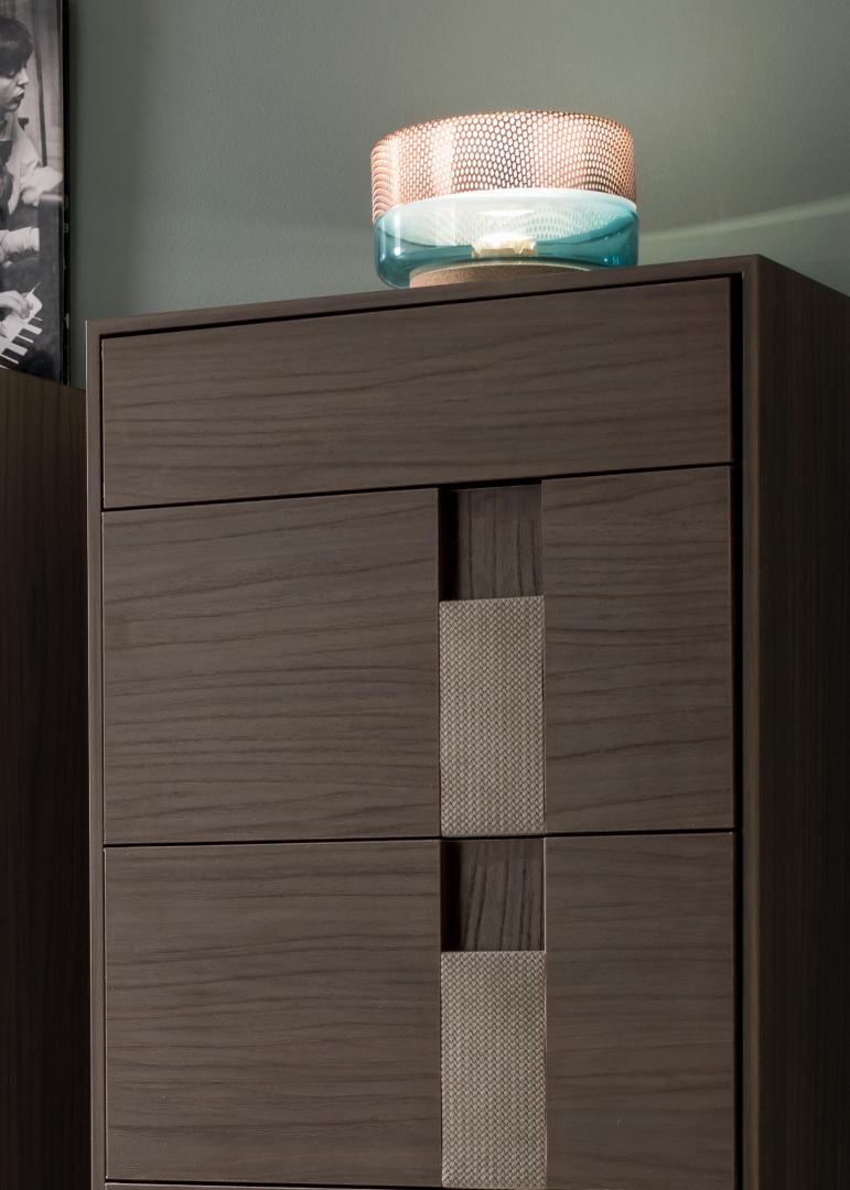 Sur les tiroirs de la commode et des tables de chevet, l’insert contrastant est un avec la poignée intégrée.