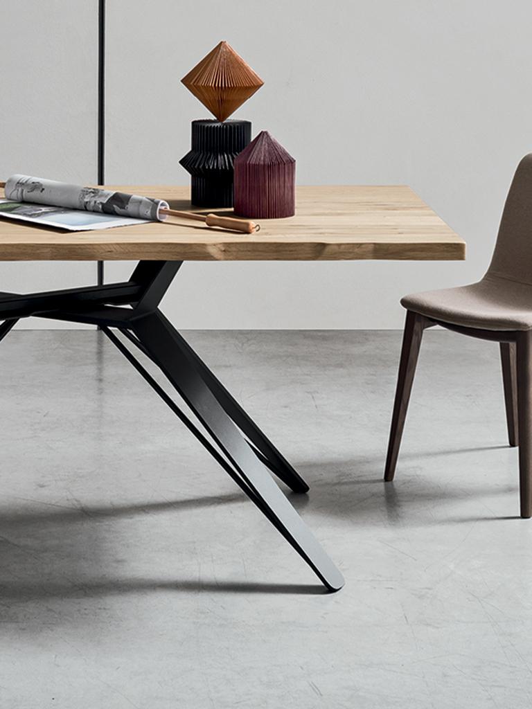 La base métallique se compose de quatre pieds inclinés. Le plateau est disponible en trois longueurs et peut être fait de verre, d’essence, de couleurs neutres, d’effets de marbre et de béton, de chêne et de frêne massif.
