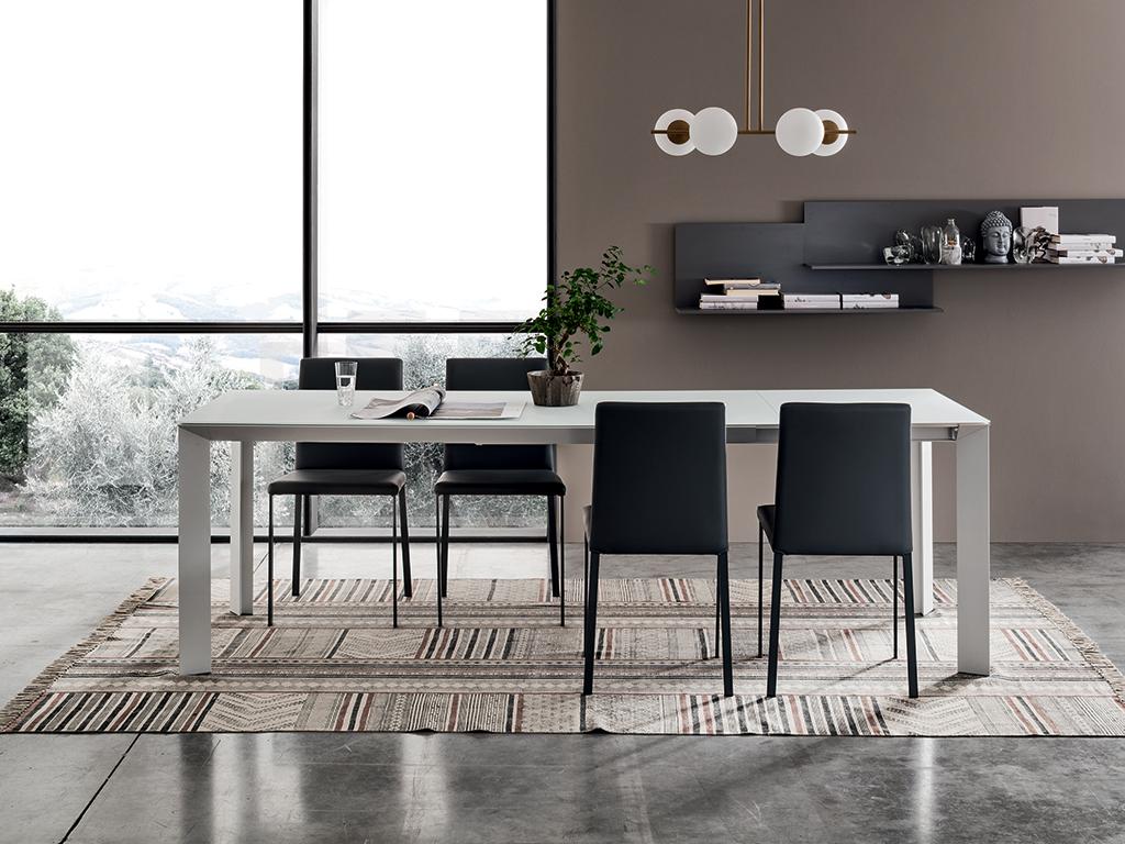 La structure métallique blanche ou noire correspond aux multiples finitions du dessus: en verre, essence, couleurs neutres, béton, chêne et couleurs laquées. La convivialité est personnalisée et étendue.