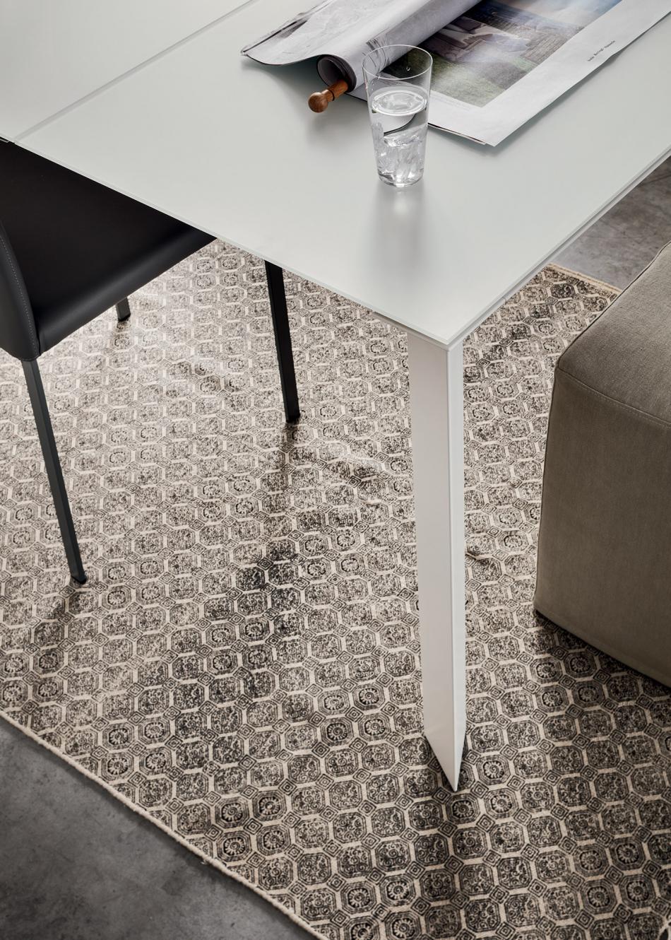 La table s’étend grâce à un mécanisme qui, en plus d’allonger le dessus, fait également glisser les pieds sur le côté.