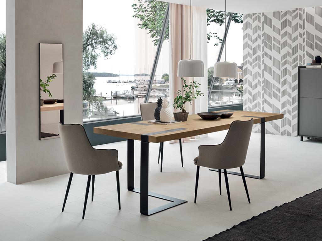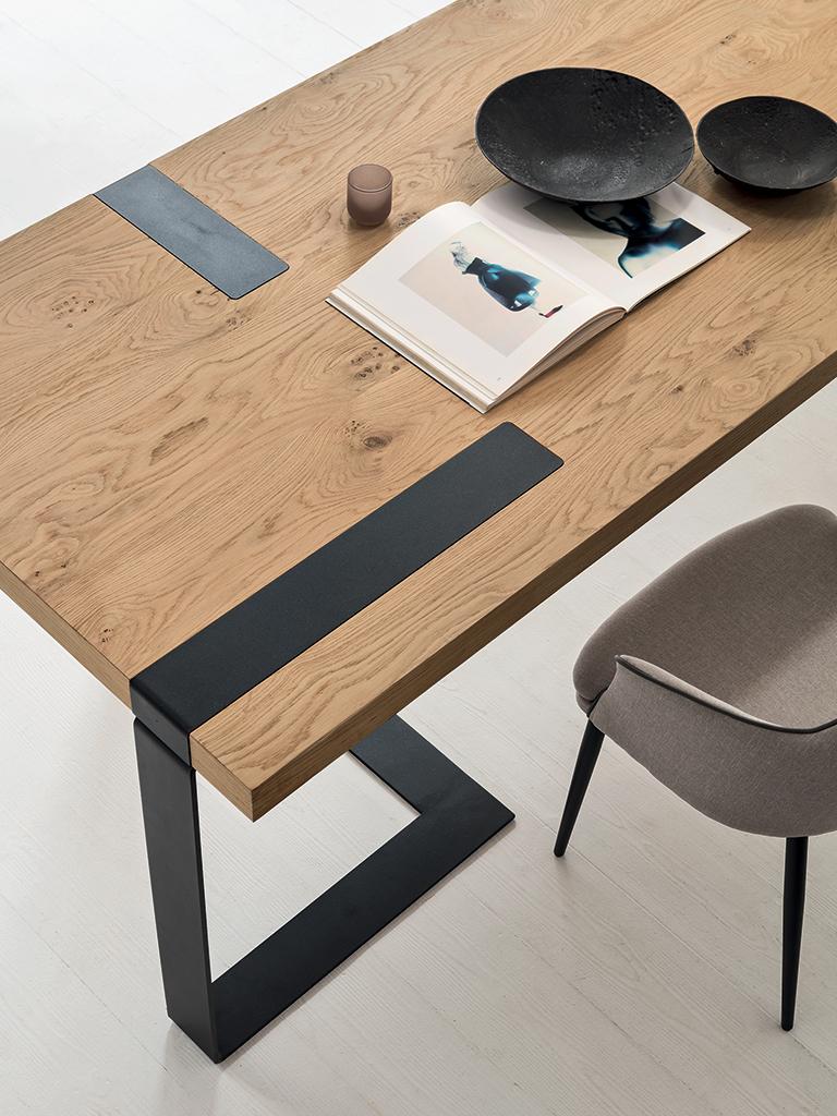 Les pieds de la table continuent vers le haut jusqu’au dessus: les inserts métalliques sont visibles sur le dessus et caractérisent le modèle dans son ensemble.